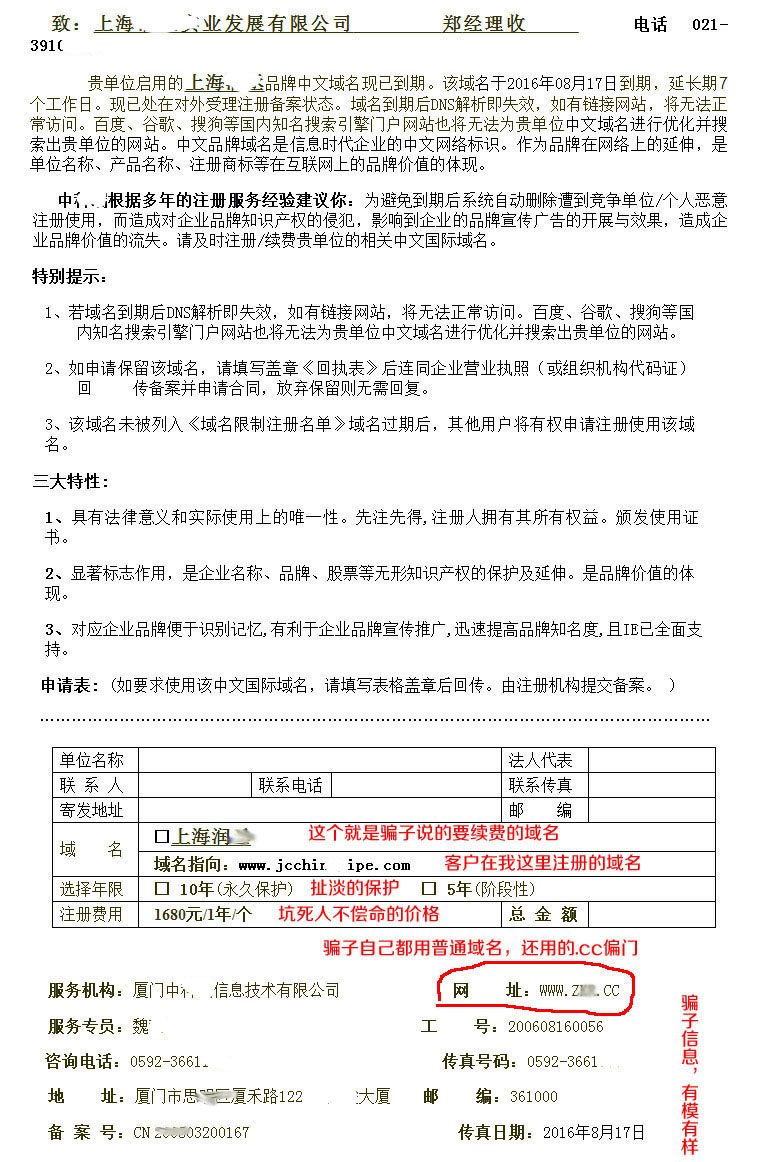 中文域名到期續(xù)費(fèi)騙局的常用套路: