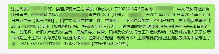 最后:告訴廣大客戶,普通中文域名無較大投資價(jià)值,我們一般不建議客戶注冊使用,且中文域名在解析時(shí)還多一步轉(zhuǎn)碼操作。如遇續(xù)費(fèi)通知?jiǎng)?wù)必打我電話確認(rèn),切勿輕易匯款!切勿輕易匯款!切勿輕易匯款!重要的事情說三遍。